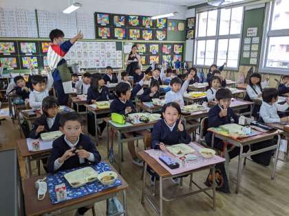 2年生の教室では、ハンドサインでおいしいを表現してくれました。