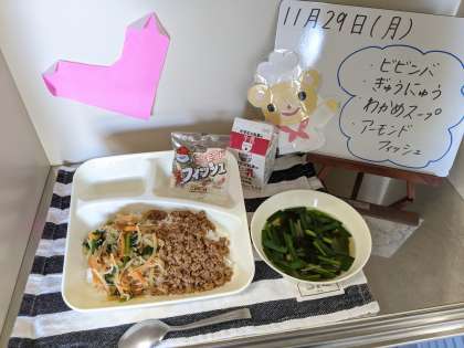 「今日の給食ビビンバだ!」「ビビンバうれしい!」「ビビンバおいしい!」と児童に好評でした。
