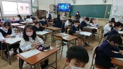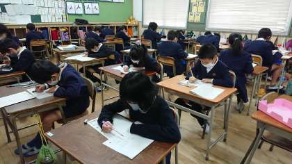 今日は、3〜6年生の経年調査の日です。2時間は国語、3時間目は社会に取り組みます。