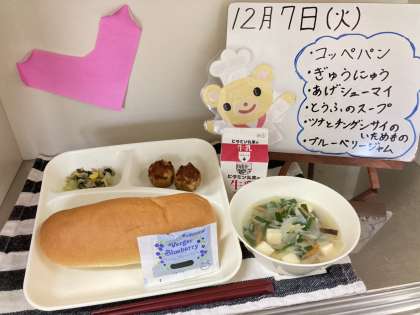 7日の給食は、コッペパン、牛乳、あげシューマイ、とうふのスープ、ツナとチンゲンサイのいためもの、ブルーベリージャムです。