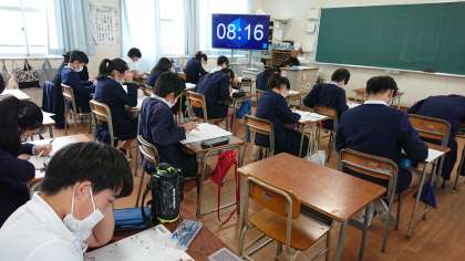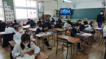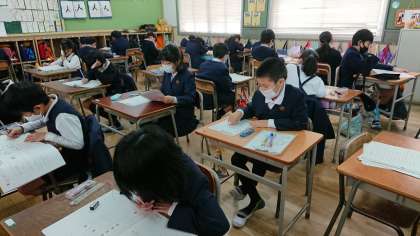 今日は、3〜6年生の経年調査2日目です。2時間は算数、3時間目は理科、4時間目は5・6年生が英語に取り組みます。