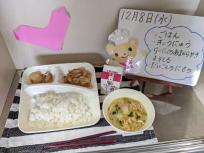 ごはん、牛乳、鶏肉の甘辛焼き、みそ汁、だいこんの煮ものです。