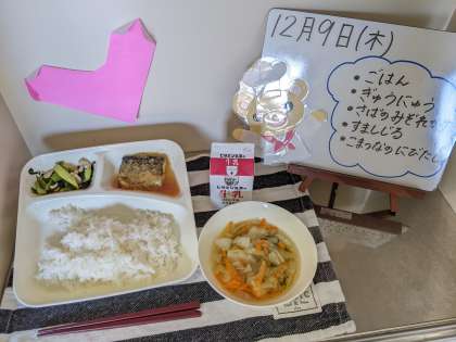 今日の給食は、ごはん、牛乳、さばのみぞれかけ、すまし汁、こまつなの煮びたしです。