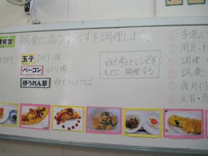 今日は6年1組が調理自習をしました。「朝ごはんに合ったおかずを作ろう」ということで、卵、ベーコン、ホウレンソウを使って、実習に取り組みました。