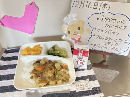 12月16日(木)の給食は、冬野菜カレーライス、牛乳、ブロッコリーとコーンのサラダ、黄桃(缶)でした。