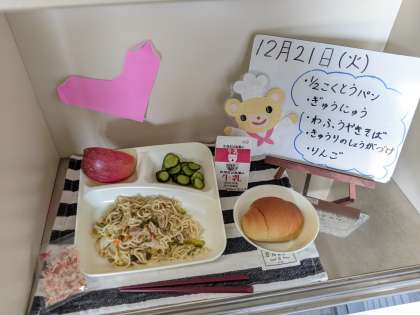 今日の給食は、1/2黒糖パン、牛乳、和風焼きそば、きゅうりのしょうがづけ、りんごです。