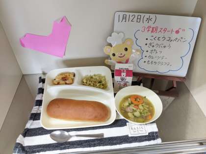 今日の給食は、黒糖パン、牛乳、ポトフ、カレーソテー、桃のクラフティです。