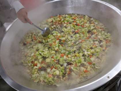 給食では牛肉とウインナー、じゃがいも、キャベツ、にんじんを使用し、チキンブイヨンで味つけしたボリュームのある煮ものです。青みにパセリを使用しました。
