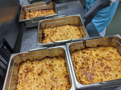 デザートは、白桃缶を使った手作りのデザート「桃のクラフティ」です。優しい甘さで子どもたちに大好評でした。