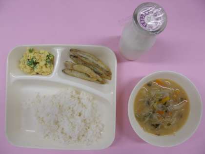 今日の献立は「きびなごてんぷら、みそ汁、えんどうの卵とじ」でした。