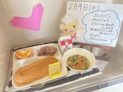 今日の給食は、コッペパン、牛乳、豚肉のオイスターソース焼き、あつあげとだいこんの中華煮、デコポン、アプリコットジャムです。