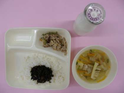 今日の献立は「豚肉のごまみそ焼き、すまし汁、のりのつくだ煮」でした。