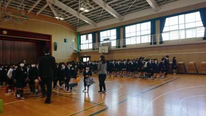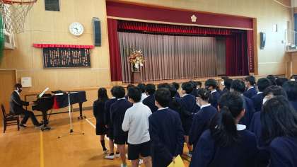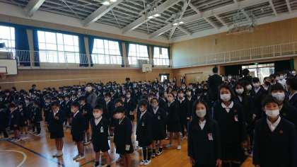 学校長の「しっかり勉強しよう」「友達と仲よくしよう」「元気にあいさつをしよう」「自分の命は自分で守ろう」という話を聞き、校歌を歌いました。