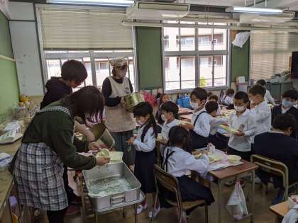 初めての給食当番の様子です。