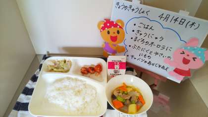 今日の給食は、まぐろのオーロラ煮、豚肉と野菜の煮もの、キャベツの赤じそあえ、ごはん、牛乳です。