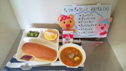 今日の給食は、ビーフシチュー、きゅうりのサラダ、あまなつかん、コッペパン(いちごジャム)、牛乳です。