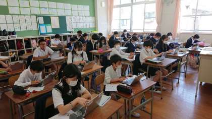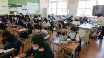 6年生が取り組みました。今年度から、1人1台端末を使い、入力します。