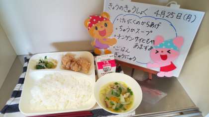 今日の給食は、鶏肉のからあげ、中華スープ、チンゲンサイのもやしと甘酢あえ、ごはん、牛乳です。