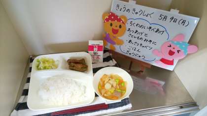 今日の給食は、ちくわのいそべあげ、あつあげとさといものみそ煮、あっさりキャベツ、ごはん、牛乳です。