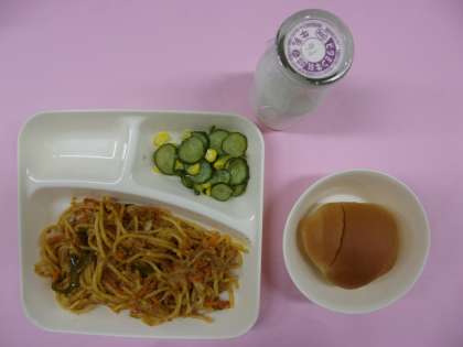 今日の献立は「スパゲッティミートソース、きゅうりとコーンのピクルス」でした。