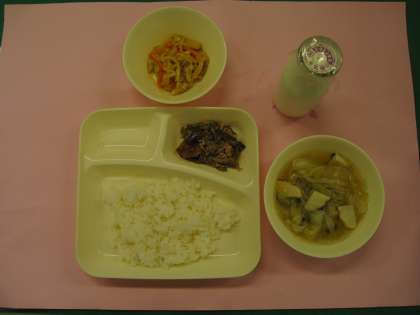 今日の献立は「豚肉の梅風味焼き、すまし汁、切り干しだいこんのいため煮」でした。