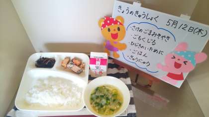 今日の給食は、さけのごまみそ焼き、五目汁、ひじきのいため煮、ごはん、牛乳です。
