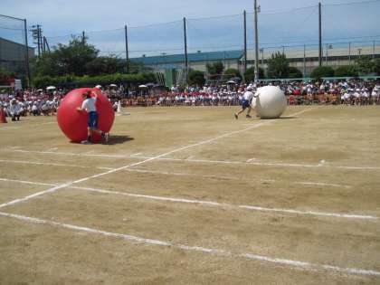 体より大きな大玉を、力を合わせて一生懸命転がし、ゴールまで運びました。