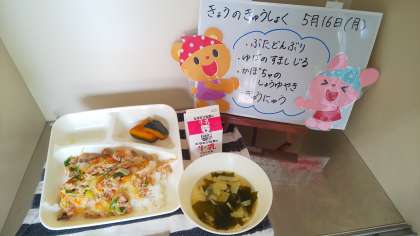 今日の給食は、豚丼、湯葉のすまし汁、かぼちゃのしょうゆ焼き、牛乳です。
