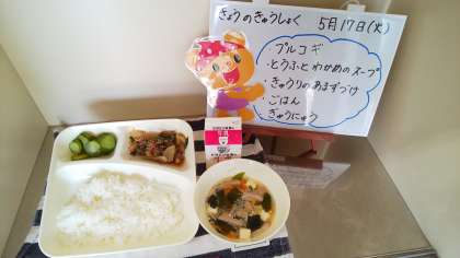 今日の給食は、プルコギ、とうふとわかめのスープ、きゅうりの甘酢づけ、ごはん、牛乳です。