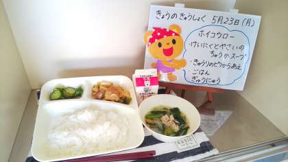今日の給食は、ホイコウロー、鶏肉と野菜の中華スープ、きゅうりのピリ辛あえ、ごはん、牛乳です。