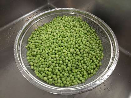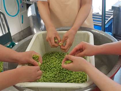 三軒家東小学校の給食室では、およそ440人分のえんどうを調理員さんがていねいに、さやから取り出してくれました。