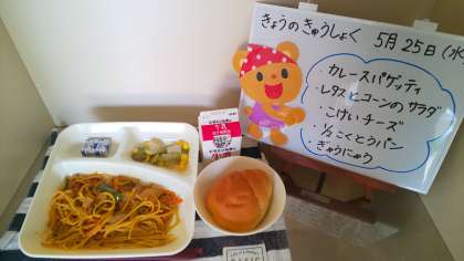 今日の給食は、カレースパゲッティ、レタスとコーンのサラダ、固形チーズ、1/2黒糖パン、牛乳です。