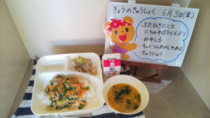 今日の給食は、豚ひき肉とにらのそぼろ丼、みそ汁、キャベツの赤じそあえ、ごはん、牛乳です。