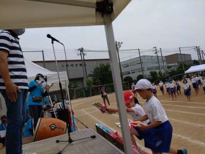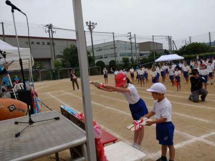 閉会式で、1年生の児童が、PTA会長様より、参加賞をいただきました。