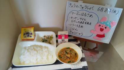 今日の給食は、マーボーはるさめ、チンゲンサイともやしの甘酢あえ、いり黒豆、ごはん、牛乳です。
