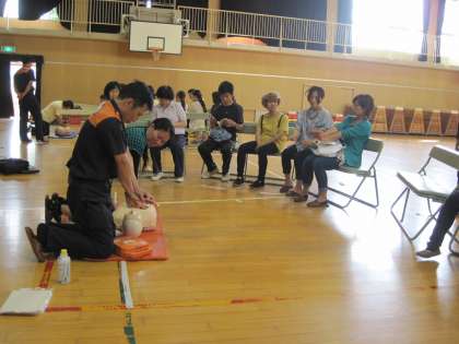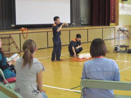 今日は、放課後「普通救命講習会」を実施しました。大正消防署の方に講師として来ていただき、人工呼吸や胸骨圧迫の仕方、AEDの使い方について、具体的に教えていただきました。その後、2グループに分かれて実習に取り組みました。