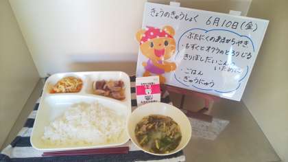 今日の給食は、豚肉の甘辛焼き、もずくとオクラのとろり汁、切干しだいこんのいため煮、ごはん、牛乳です。