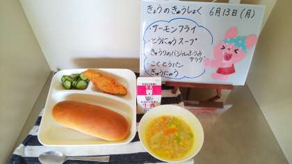 今日の給食は、サーモンフライ、豆乳スープ、きゅうりのバジル風味サラダ、こくとうパン、牛乳です。