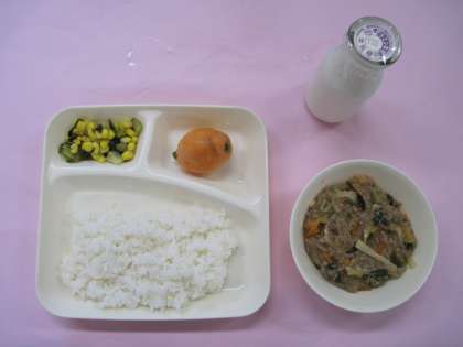 今日の献立は「マーボーはるさめ、チンゲンサイとコーンの甘酢あえ、びわ」でした。