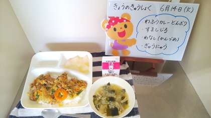 今日の給食は、和風カレー丼、すまし汁、和なし(缶詰)、牛乳です。
