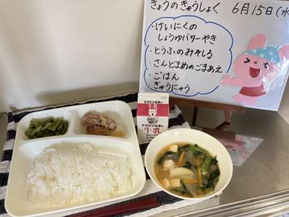 今日の給食は、鶏肉のしょうゆバター焼き、とうふのみそ汁、さんどまめのごまあえ、ごはん、牛乳です。
