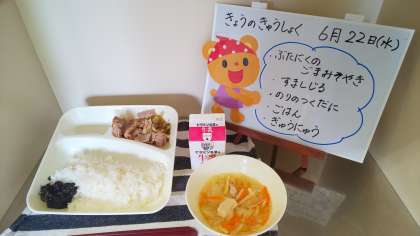 今日の給食は、豚肉のごまみそ焼き、すまし汁、のりの佃煮、ごはん、牛乳です。