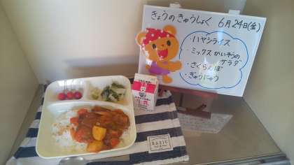 今日の給食は、ハヤシライス、ミックス海そうサラダ、さくらんぼ、牛乳です。