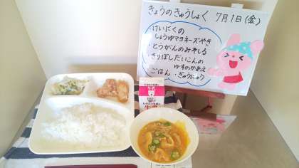今日の給食は、鶏肉のしょうゆマヨネーズ焼き、とうがんのみそ汁、切干しだいこんのゆずの香あえ、ごはん、牛乳です。