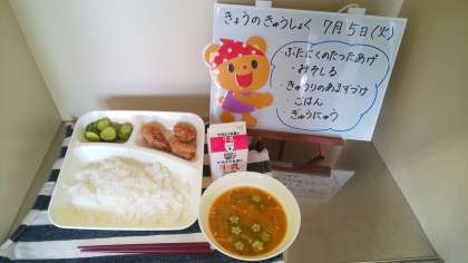 今日の給食は、豚肉のたつたあげ、みそ汁、きゅうりの甘酢づけ、ごはん、牛乳です。