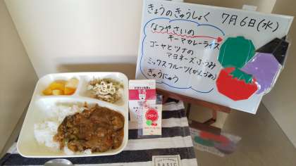 今日の給食は、夏野菜のキーマカレーライス、ゴーヤとツナのマヨネーズ風味、ミックスフルーツ(缶詰)、牛乳です。