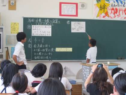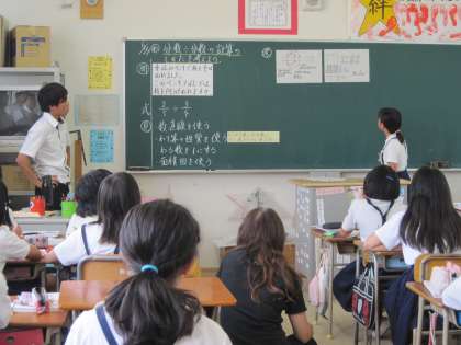 分数÷分数の計算の仕方を、既習の内容から導き出す学習をしました。数直線を使ったり、面積図を使ったり、わり算の性質を使ったりして考えました。