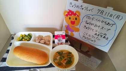 今日の給食は、鶏肉のからあげ、中華みそスープ、きゅうりとコーンの甘酢あえ、こくとうパン、牛乳です。