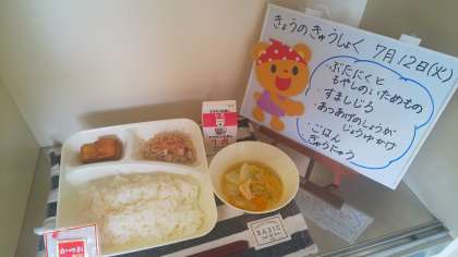 今日の給食は、豚肉ともやしのいためもの、すまし汁、あつあげのしょうがじょうゆかけ、ごはん、牛乳です。