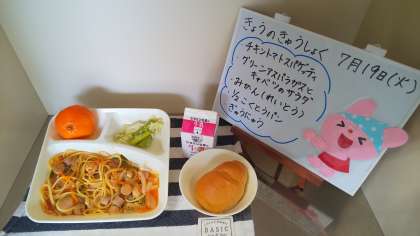 今日の給食は、チキントマトスパゲッティ、グリーンアスパラガスとキャベツのサラダ、みかん(冷凍)、1/2黒糖パン、牛乳です。
